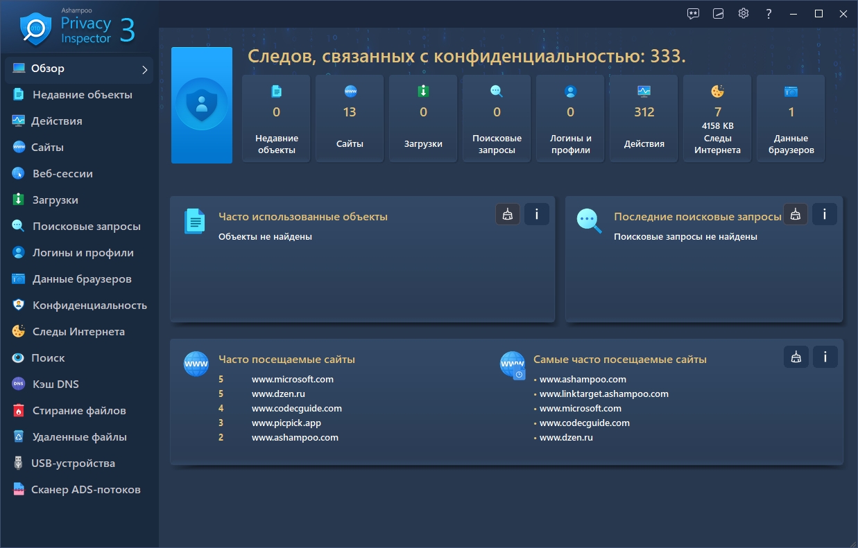 Логины и браузеры Множество сайтов в наши дни требуют, чтобы мы входили с выделенными именем пользователя и паролем. И где ты сегодня оставил свои данные для входа? Какую именно информацию ты вводил в формы и как часто ты посещал соответствующие страницы? Насладись 100% прозрачностью и точностью с Ashampoo Privacy Inspector!
