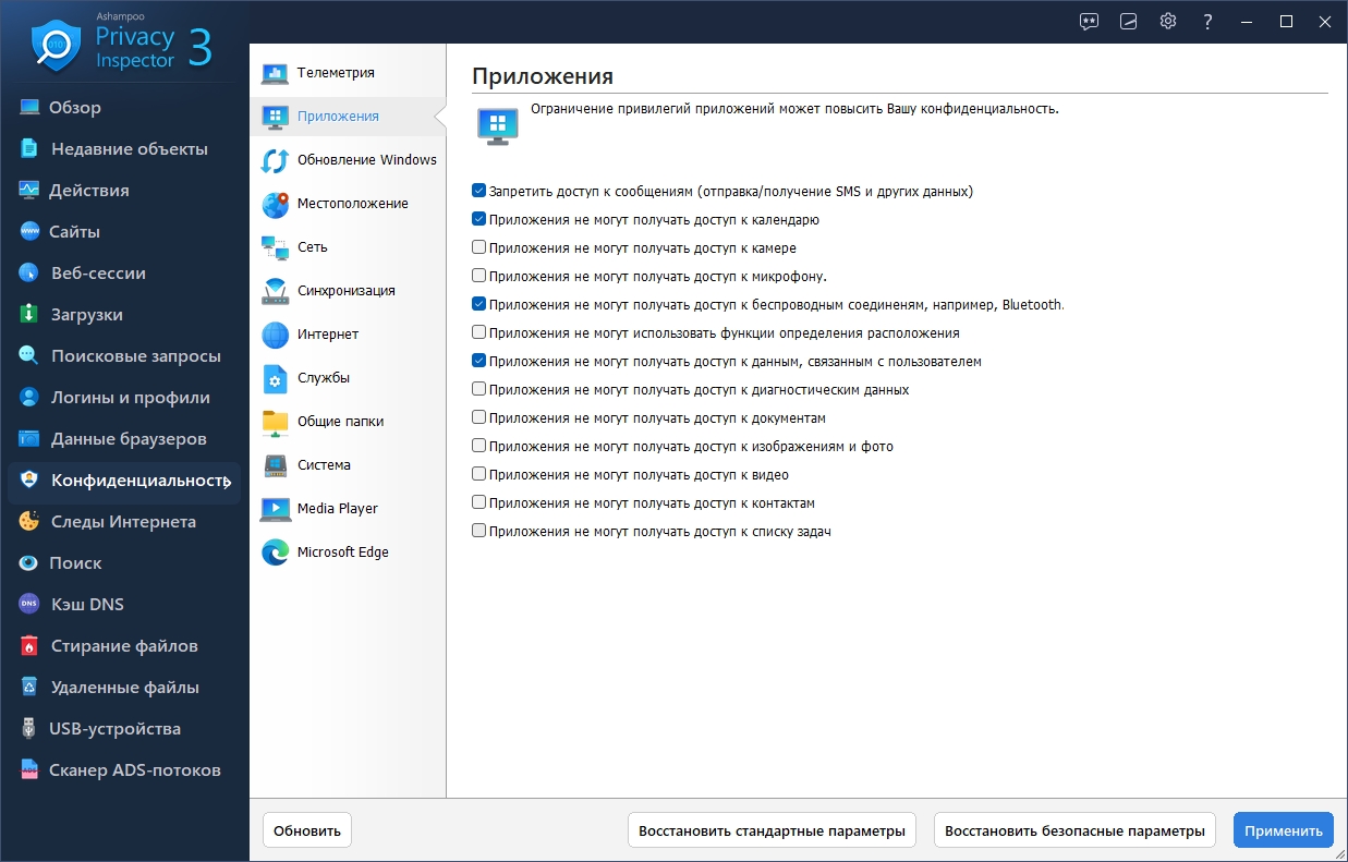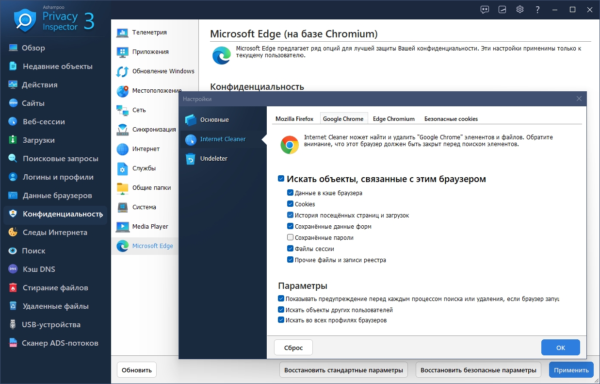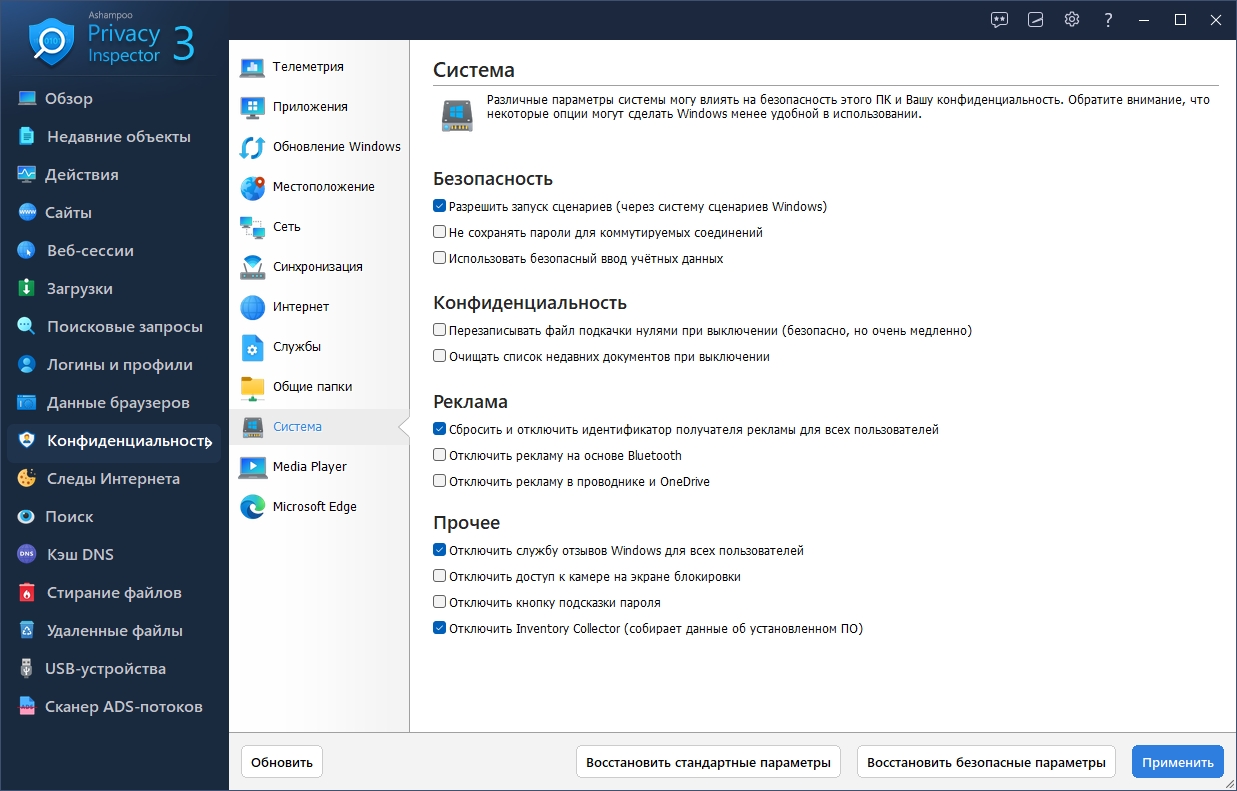Повышенная безопасность данных и операционной системы В разделе «Конфиденциальность» ты найдёшь множество новых настроек, позволяющих повысить безопасность Windows, приложений и браузеров. Модуль Internet Cleaner был усовершенствован: удалённые элементы теперь отображаются в истории, а последние версии браузеров поддерживаются в оптимальном режиме. Также появился модуль File Wiper, который позволяет безвозвратно удалять конфиденциальные данные и папки. Даже с помощью специализированного программного обеспечения эти файлы невозможно восстановить, что гарантирует сохранение твой конфиденциальности!