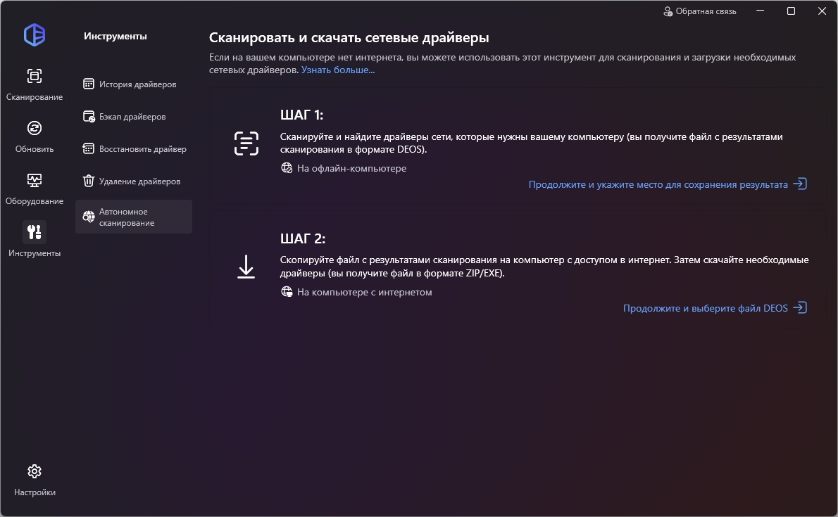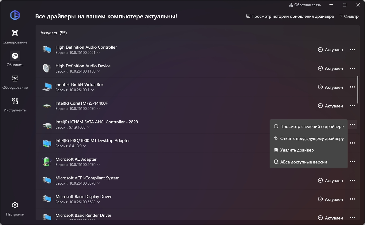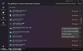 Особенности: Автоматически обнаруживает неизвестные устройства и автоматически производит загрузку драйверов Производит обновление по выходу обновленных версий драйверов База более 1000000 различных драйверов Производит резервное копирование, восстановление и удаление драйверов Многоязычный интерфейс Программа крайне проста в использовании