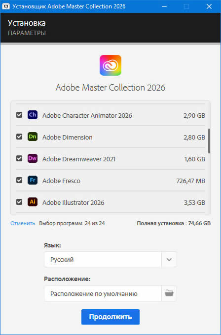 Мы оба хорошо постарались, чтобы этот пакет появился на свет. Adobe Master Collection 2026 представляет из себя сборник приложений линейки Creative Cloud 2026, объединённых мультиязычным инсталлером с возможностью выбора пути установки и языка интерфейса устанавливаемых программ. По функционалу все очень похоже на хорошо зарекомендовавший себя в прошлом Adobe Master Collection CS6. Только, вот, интерфейс установщика претерпел серьёзные изменения по сравнению с его тёзкой линейки Creative Suite 6, несколько изменился состав пакета, да и версии самих программ, определённо, свежее.