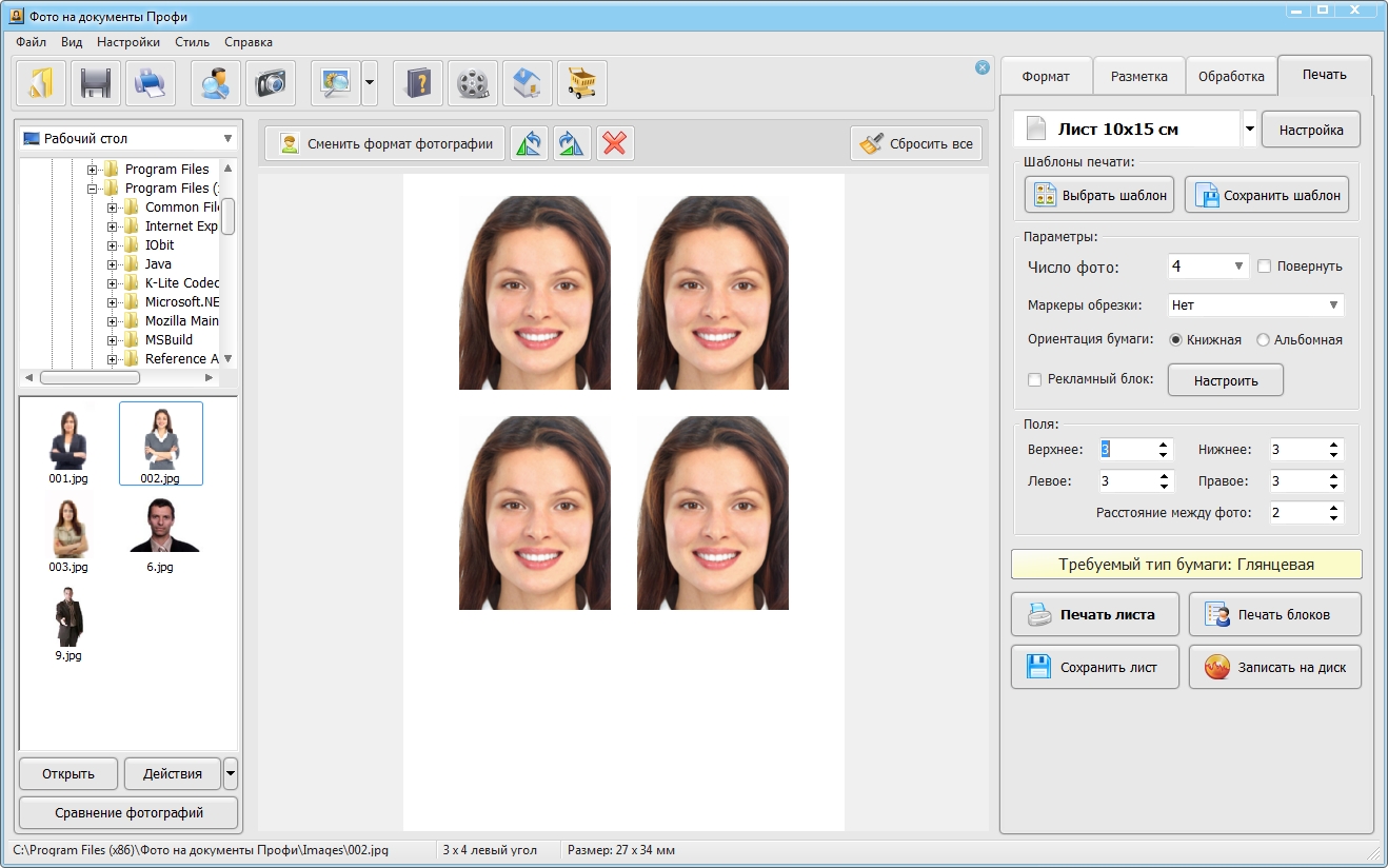 Удобная распечатка фотографий • Программа Фото на документы поддерживает распечатку фотографий на бумаге любых форматов. Размеры листа можно настраивать. • Портретная и альбомная ориентация страницы. • Возможность выбора числа фотографий на странице. • Функция быстрой калибровки монитора. • Сохранение готовых макетов листа для печати. • Добавление направляющих для удобной обрезки