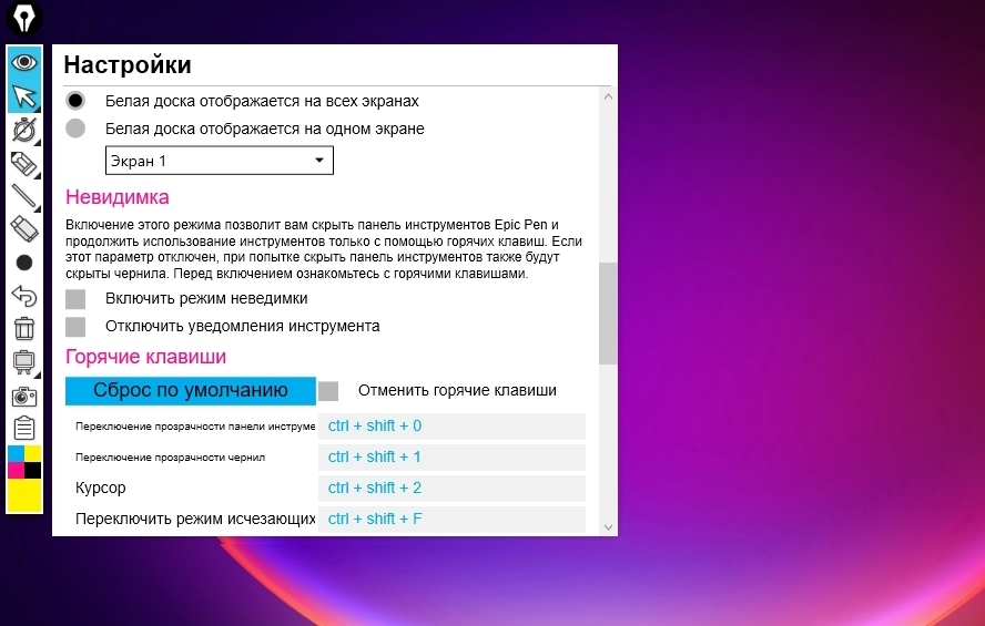 Созданный «шедевр» можно скрывать и открывать буквально «на лету» с помощью параметра Hide Ink. Кроме того, приложение предлагает воспользоваться горячими клавишами для переключения между инструментами. Возможные комбинации есть в сплывающих подсказках.