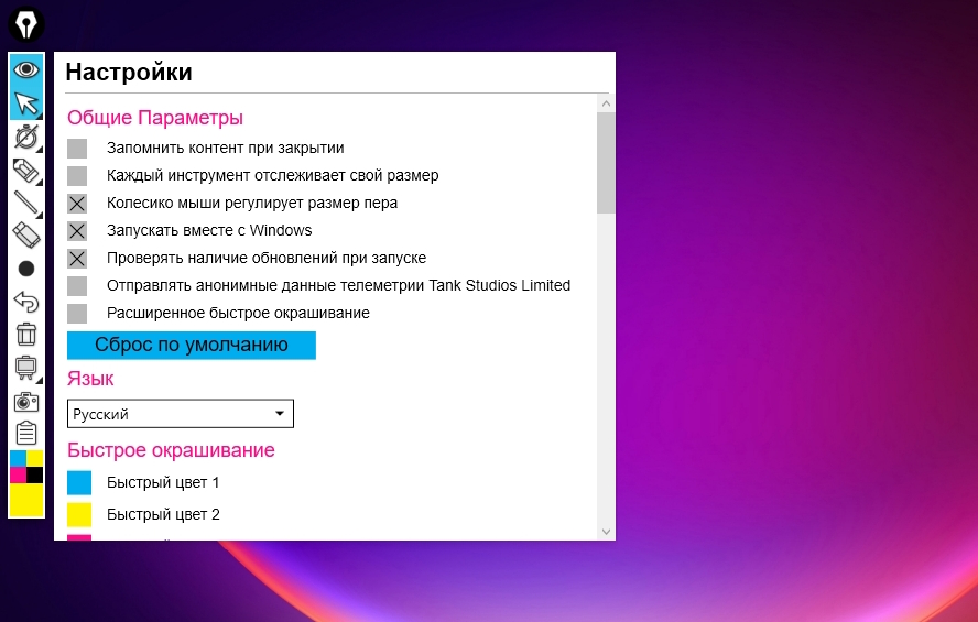 Программа также пригодится при создании технических аннотаций или просто для рисования на рабочем столе. Пользователь может использовать инструменты «карандаш» или «маркер» и ластик для отмены всех действий или их корректировки. Толщину маркера или карандаша можно изменять, также как и цвет. Палитру не назовёшь богатой, но она предлагает базовый набор красок: зелёный, красный, белый, розовый, коричневый, синий и т. д.