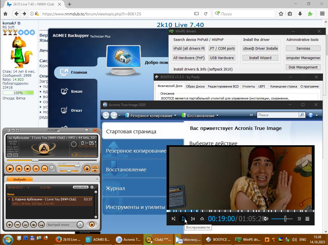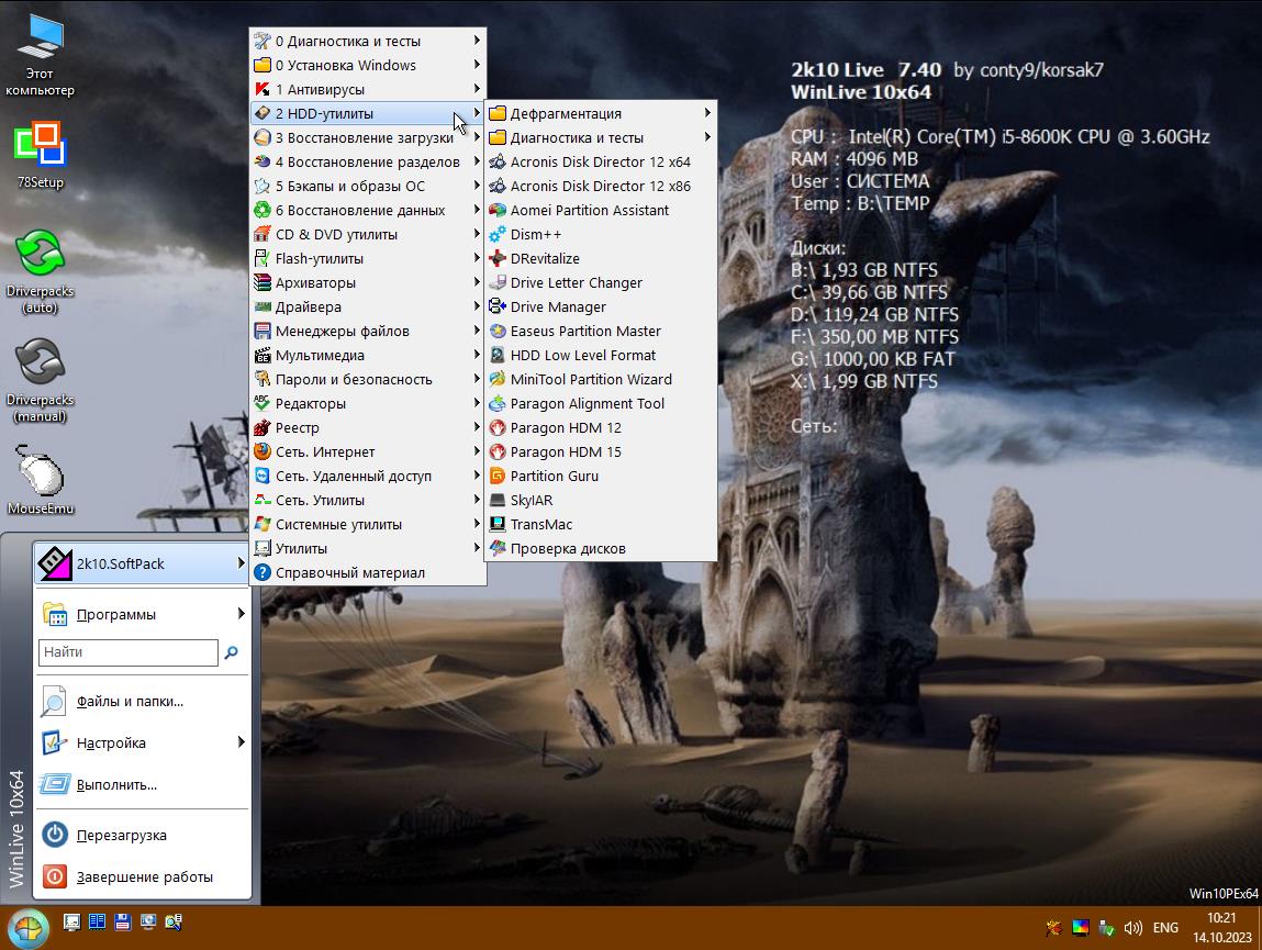 Возможности: • Установка Windows 7, 8.1, 10 и 11 с предустановленными дополнительными системными библиотеками (C++ Redistributable Package), с возможностью выбора опций установки и наличием MSDaRT. А также инсталляции Windows c уже предустановленным (или без — по выбору) Word, Excel и PowerPoint • Установка Windows XP • Замена/добавление своих версий Windows • запуск WinPE С9PE, 7×86, 7×64, 8×86, 8×64, 10×86, 10×64, 11×64 из сборки Sergei Strelec и 2k10 Live • очистка/лечение ОС от вирусов/троянов/блокеров/баннеров • восстановление данных, операционной системы и её загрузки • создание/разворачивание образов системы • тестирование hardware-компонентов компьютера • поддержка мультимедиа и сети с возможностью выхода в интернет • включает программный пакет из более 400 программ • модульная структура сборки, что даёт практически неограниченные возможности редактирования сборки пользователем под свои требования • поддержка UEFI, в том числе х32