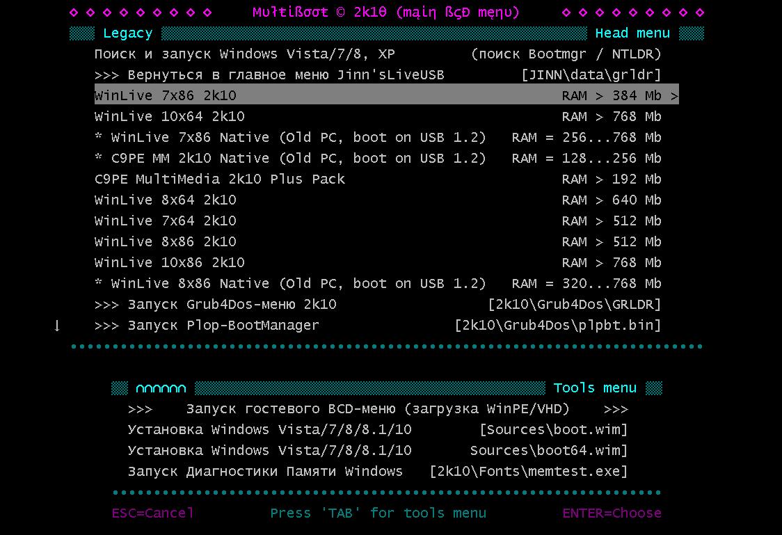 Если не удается загрузиться с записанного USB-накопителя в legacy/CSM-режиме: Если не удается загрузиться с вашего USB-накопителя в legacy/CSM-режиме и выдает какую-то ошибку, то попробуйте запустить с только что созданного USB-накопителя "Сменить загрузчик флешки" из папки "JINN" и методом перебора подберите какой-то другой загрузчик (grub4dos, bootmgr или xorboot).