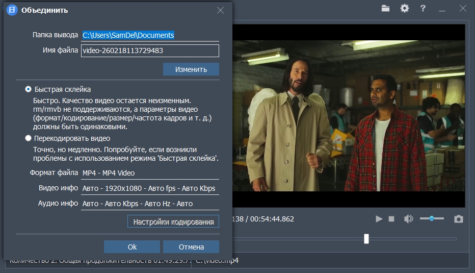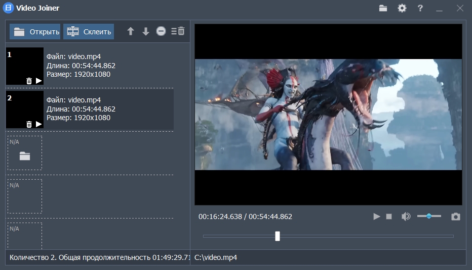 Функции объединения: — Любое количество видео может быть объединено. — Объединённое видео может быть в любом видеоформате. — Поддерживает популярные форматы видео: AVI, MPEG, MP4, WMV, 3GP, FLV… и другие — Может воспроизводить любое видео.
