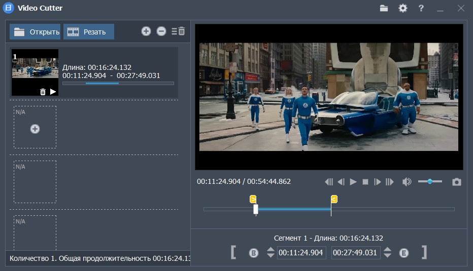 Функции резки: — Вырезать несколько видеоклипов одновременно. — Установить начальную и конечную точки видеоклипов, очень просто. — Высокая скорость резки видео. — Обрезка без потерь с тем же качеством, что и исходное видео. — Вырезанные части можно конвертировать в другие видеоформаты. — Поддерживает популярные форматы видео: AVI, MPEG, MP4, WMV, 3GP, FLV… и другие — Воспроизведение видео из любого места.