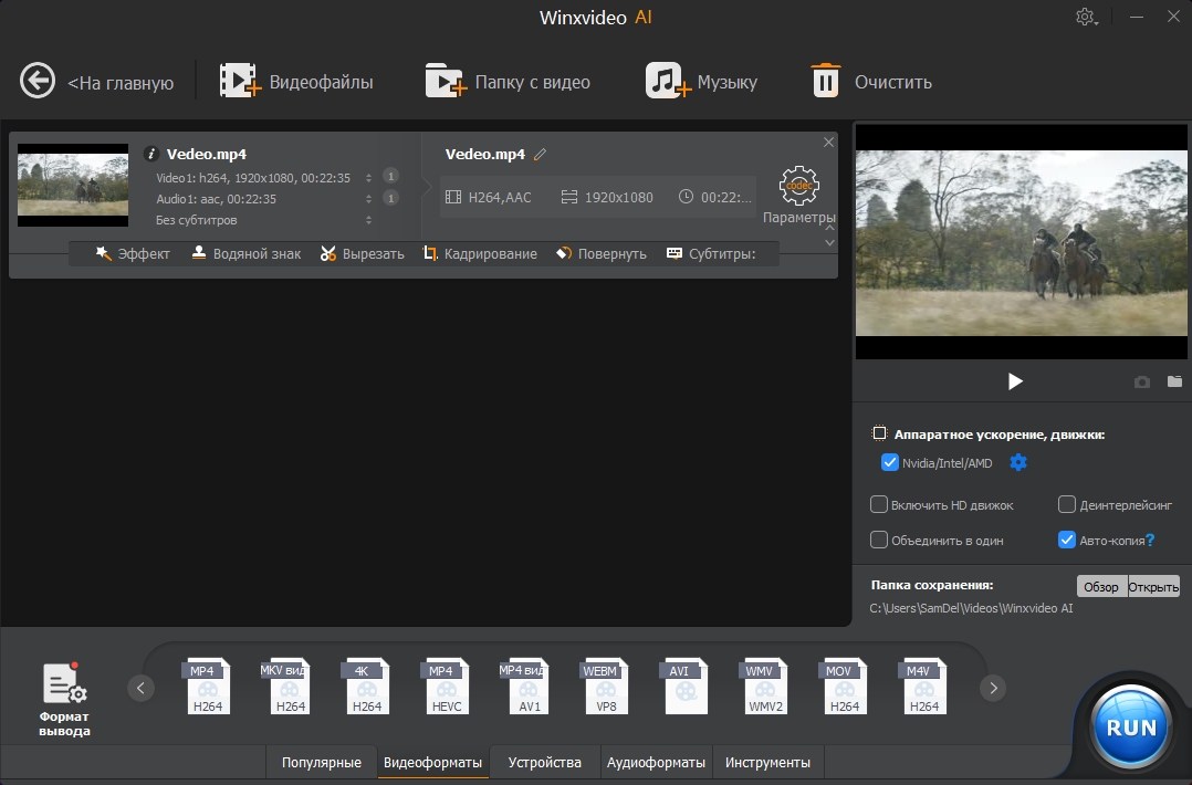Конвертируйте и сжимайте видео 4K/8K/HDR — полное ускорение графического процессора Попрощайтесь с проблемами совместимости форматов и огромными размерами файлов. Winxvideo AI позаботится обо всех ваших потребностях в преобразовании аудио/видео и сжимает отснятый материал 4K/8K из ГБ в МБ без ущерба для качества, опираясь на полное ускорение графического процессора. Winxvideo AI поможет вам воспроизвести локальные файлы на мобильном телефоне/ПК, превратить приключения GoPro в компактные чудеса или поделиться заветными воспоминаниями в социальных сетях.
