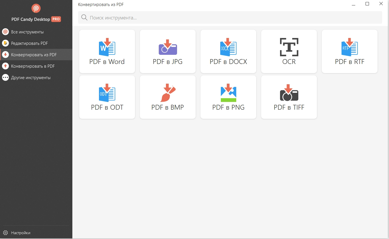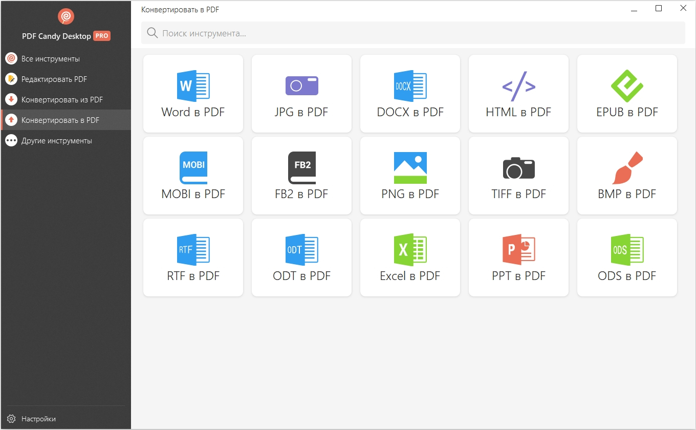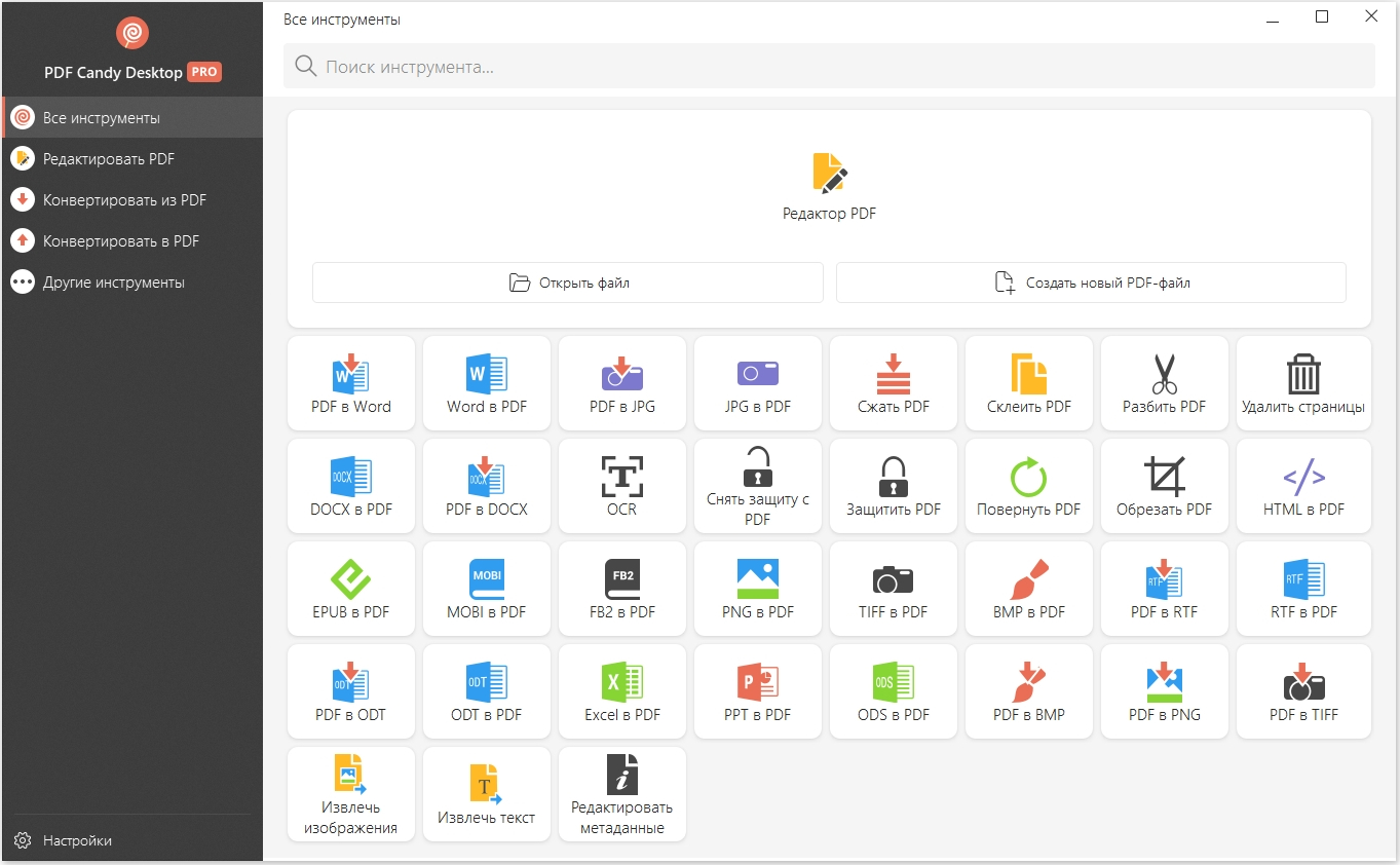 Доступны PDF инструменты: PDF в Word; Word в PDF; PDF в JPG; JPG в PDF; Объединить PDF; Разбить PDF; Удалить страницы; Снять защиту с PDF; Защитить PDF; HTML в PDF; EPUB в PDF; MOBI в PDF; FB2 в PDF; PPT в PDF; Excel в PDF; ODT в PDF; PNG в PDF; TIFF в PDF; BMP в PDF; PDF в PNG; PDF в TIFF; PDF в BMP; Извлечь изображения; Извлечь текст; Редактировать метаданные.