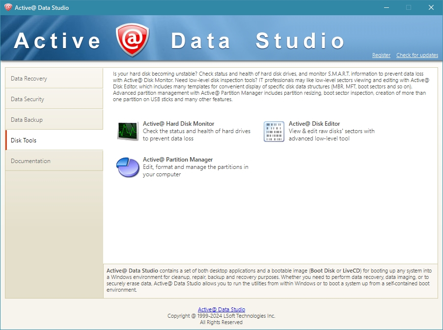 Data Studio включает в себя следующие инструменты: • Active@ Boot Disk • Active@ KillDisk • Active@ Disk Image • Active@ File Recovery • Active@ Partition Recovery • Active@ UNDELETE • Active@ Password Changer • Active@ Partition Manager • Active@ Disk Monitor • Active@ Disk Editor • Active@ CD/DVD Data Burner • Active@ ISO Manager