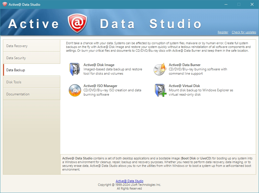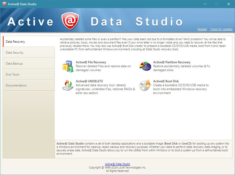 Active Data Studio — программа, содержащая набор настольных приложений, которые помогут восстановить забытые пароли, создать резервную копию, надежно удалить данные и т. п. Также предлагает воспользоваться загрузочным диском, если система не запускается.