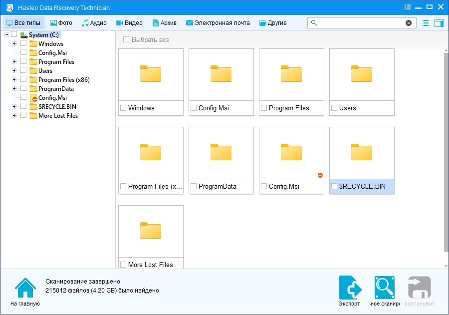 Восстановление всех типов файлов: Hasleo Data Recovery поддерживает все основные типы файлов, включая фотографии, электронные письма, видео, документы, аудио, архивы, чертежи и многое другое.